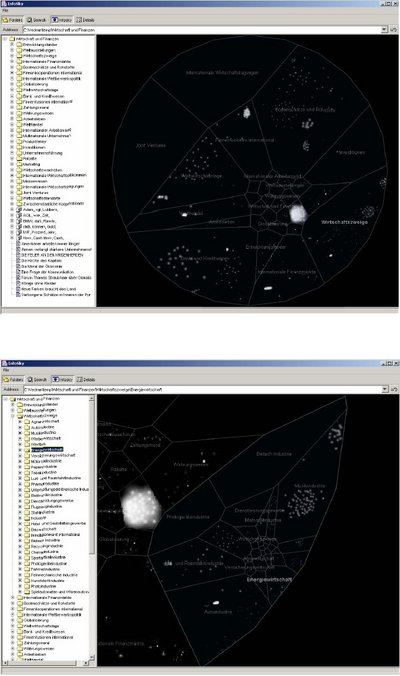 Suitable Datatypes for this information visualization technique are hierarchical information structures. The goal of InfoSky is to reduce the complexity of large amounts of text-data (for examples collections of newspaper articles) by presenting it through the metapher of a telescope view in a hierarchically structured form. Text-data can be either Word documents, PDF or HTML files.