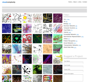 VisualComplexity.com intends to be a unified resource space for anyone interested in the visualization of complex networks. The project's main goal is to leverage a critical understanding of different visualization methods, across a series of disciplines, as diverse as Biology, Social Networks or the World Wide Web. I truly hope this space can inspire, motivate and enlighten any person doing research on this field.