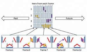 For each video frame, the pictures under each slit are captured and aligned into a vertical column which is appended to the right side of the visualization. The bottom of the image represents a number of video frames that capture a top-down view of a room with three blue doorways. Herein, four slits have been manually defined. The actual slit-tear visualization above shows the occurence of events. In frame two, a person walks towards to the bottom door, crossing slit number 2. This intrusion is captured and can be seen as yellow trace in successive frames for the corresponding slit.