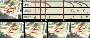 This image shows how events can be visualized spatially which allows for a discovery of patterns and for an effective correlation of events. Frames t1 to t5 capture a traffic intersection at particular moments in time according to the three slits, drawn by the observer. The interaction of cars and pedestrians is visualized by setting up a timeline for each pre-defined slit where the movement of the objects is depicted by strokes of different length, based on their orientation to each slit.