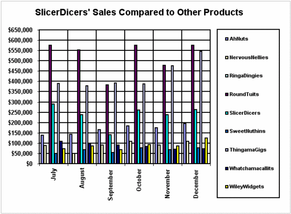 - + Since the graphic shows a comparison of overall sales, and "RingaDingies" never have a value higher than zero, we removed it from our graphic.