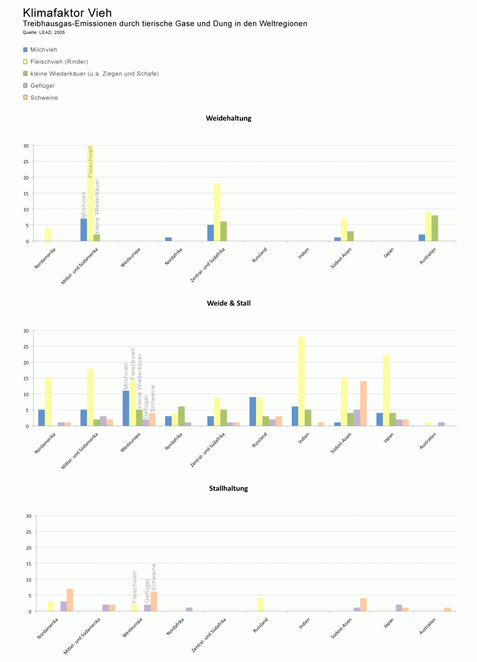 Treibhausgas-Emissionen durch tierische Gase und Dung in den Weltregionen