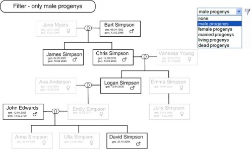 Die Visualisierung soll die interaktive Auseinandersetzung mit den Daten ermöglichen. Verpflichtend: Möglichkeiten zum besseren Vergleich von einzelnen Abschnitten der Stammbäume bzw. Vergleich von Ausschnitten aus Lisas und Barts Stammbäumen. + mind. 2 weitere Interaktionsmöglichkeiten (z.B., Details on Demand, Filteroptionen)
