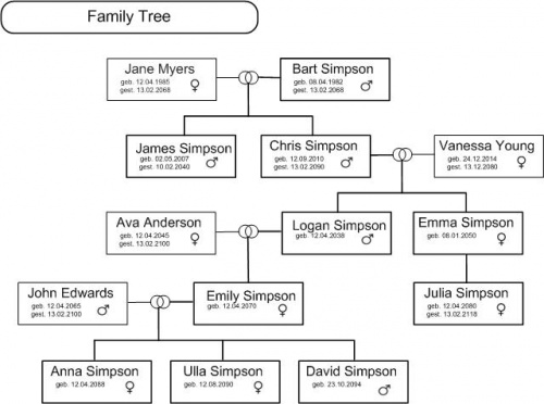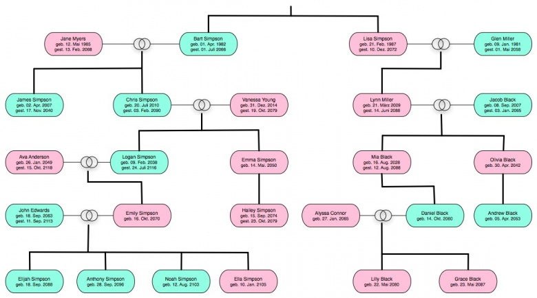 ...Visualisierung der Nachkommen von Lisa Simpson sowie der Nachkommen von Bart Simpson. Dabei sollen zwei Stammbäume entstehen - einer von Bart und einer von Lisa - die dann miteinander verglichen werden können. Zuerst kommen Lisa und Bart, dann deren Kinder, ihre Enkel, etc. (mind 4 Generationen). Da es noch keine Nachkommen gibt, können diese frei erfunden werden.