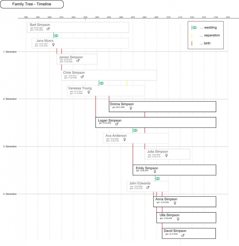 you can switch between the normal and the timeline view. In the timeline view you can see important events e.g wedding, separation, birth. For more detailed information double-klick on the person(Details on Demand). Dead people are grayed out and the day of death is shown in the box.