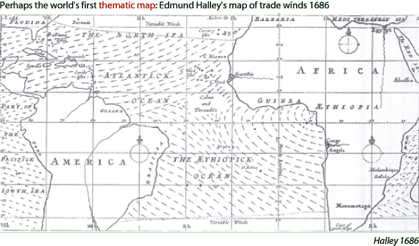 The 'Nubian Goldmine' map (ancient world ) could already be labeld as a thematic map, however in a sense thematic maps existed since the 16th/17th century. For Example, Edmond Halley (1686) created a map, which included the information of the direction of trade winds in the Atlantic Ocean.