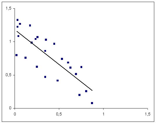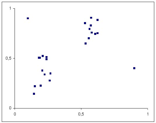 Figure 2 features a regression line to increase its expressiveness. This is the line that passes through the plot as close to the points as possible. The regression function is not necessarily chosen linear as in this example. Any kind of curve may fit a plot (quadratic curves, splines, ...) and must be chosen according to the subject matter. In general, the curve with the smallest sum of squared distances to the plotted points is sought after (least squares fitting), [NetMBA, 2008]. For an introduction on linear regression, see [Wikipedia 4, 2008] and [Wikipedia 5, 2008]. Further properties of data sets can easily be discovered by the presence of clusters and outliers as denoted in Figure 3.