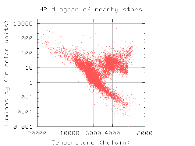 A prominent example of a scatterplot with two variables is the Hertzsprung-Russell diagram (HRD) in astronomy (Figure 5). It plots absolute magnitude (intrinsic brightness) of stars against their spectral types and shows a rich set of features, such as clusters and a central filament (the main sequence), [Britannica, 2008].