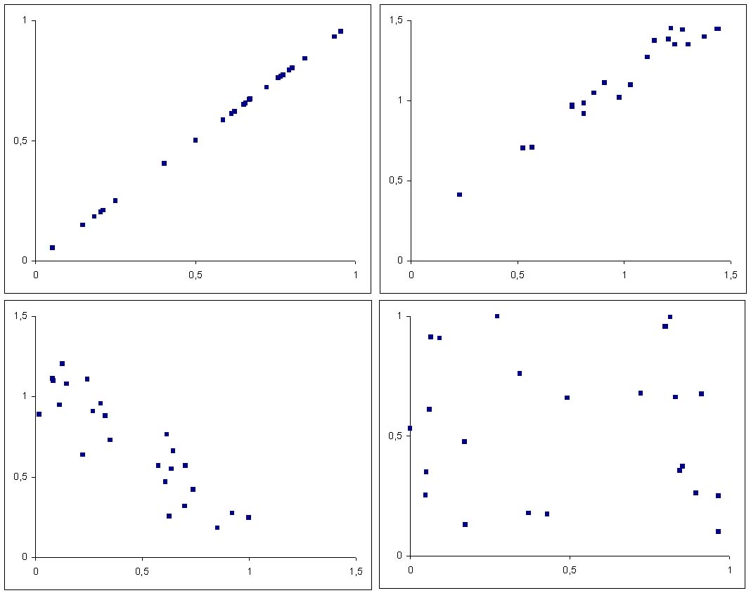 An example of perfect correlation can be seen in the upper left of Figure 1 together with other patterns: Strong positive (upper right), weak negative (lower left) and one example of variables without significant correlation.